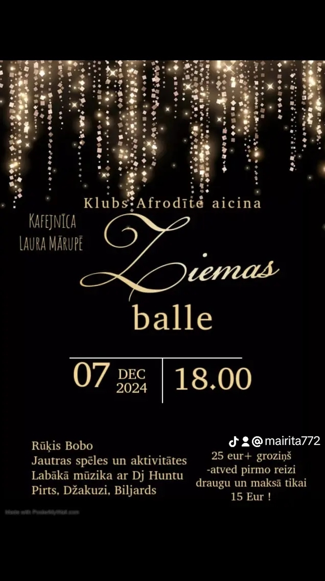 Visi mīļi aicināti uz Ziemas Balli Jaunmārupē pirts kubls biljards, dažādi pārdteigumi, ir iespēja nakšņošanai, piesakaties privāti, vietu skaists ierobežots.