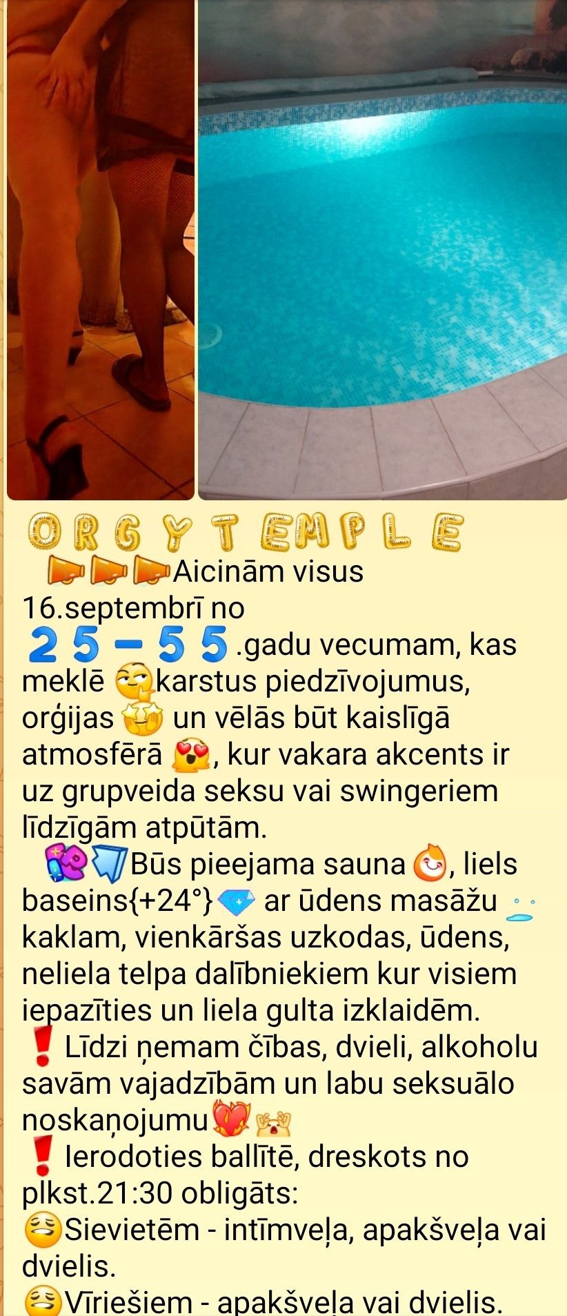 Vakara akcents ir uz grupveida seksu vai swingeriem līdzīgām atpūtām. Būs pieejama sauna😊, liels baseins{+24°}💎 ar ūdens masāžu💧 pleciem, vienkāršas uzkodas, ūdens.